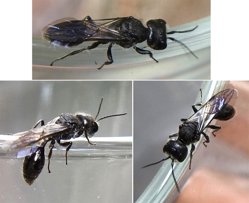 Small (ca. 1 cm) all-black wasp with rather large, square head with white hairs on face. Abdomen with very well-developed waist. Identification tentative.