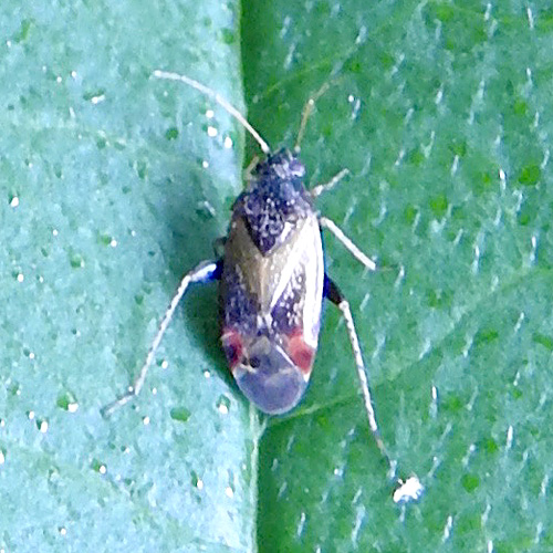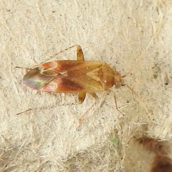 Small (4 mm) rusty brown-red bug with pale crescent behind the corium. A The antennae are pale, the hind femora are pale with black spots, and the hind tibiae have black spines arising from a row of dark spots. Possibly Psallus flavellus but firm id requires dissection. Caught in moth light trap 23rd May, 2025. On hedge, 16th June, 2025.