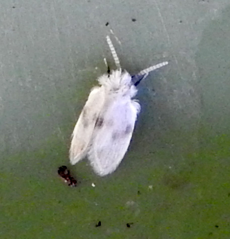 Tiny (3 mm) white owl midge with wings held parallel and tent-like, and crossed mid-length by a series of dark spots forming the letter "W". Head covered in long white hairs and antennae black and white banded. Inside lid of green recycling bin.