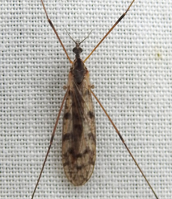 Cranefly with mottled wings, plain brown femurs with black bands distally, and strongly noded/pectinate antennae. Caught in light trap 17th August, 2023. Caught in light trap 17th May, 2024. Attracted to light trap 14th August, 2024, and again 2nd November, 2024. In greenhouse 21st June, 2025.