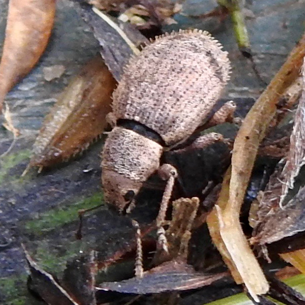 Small (5 mm), pale-brown weevil with short, blunt nose, elbowed antennae, black speckling on elytra which are covered in short hairs; a prominent black ring separates the elytra from the pronotum. In wild flower border.