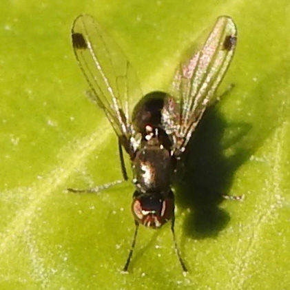 Small (3-4 mm) dipteran with black body and very short antennae. Wings with sparse veins and coloured spot towards tip of leading edge. Waves its wings as it walks around.
