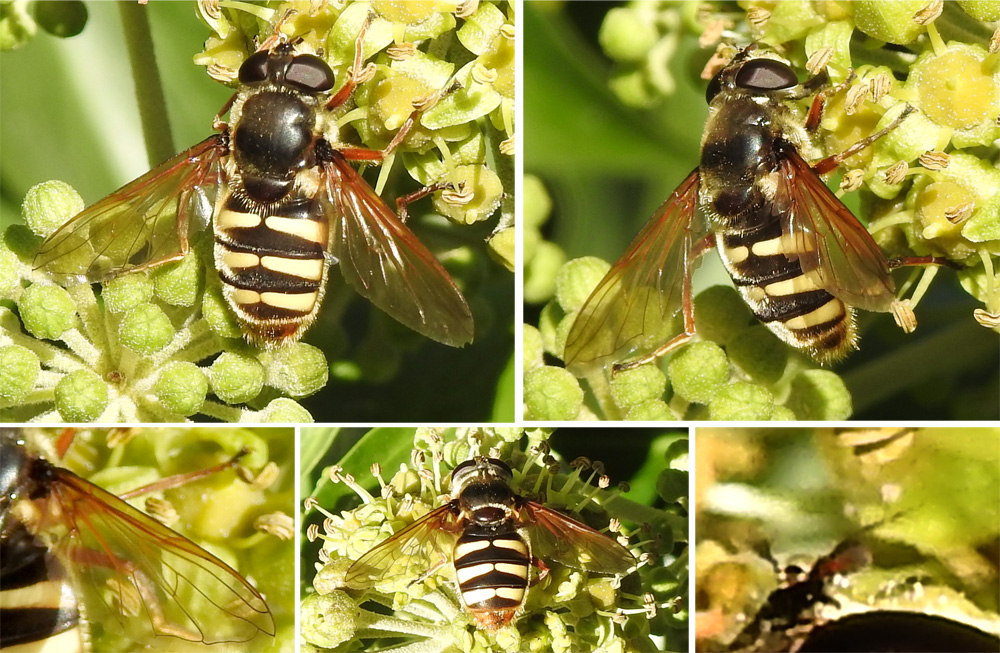 Large black and yellow banded syrphid with reddish-brown wings. Aristae plumose. Visiting ivy flowers.