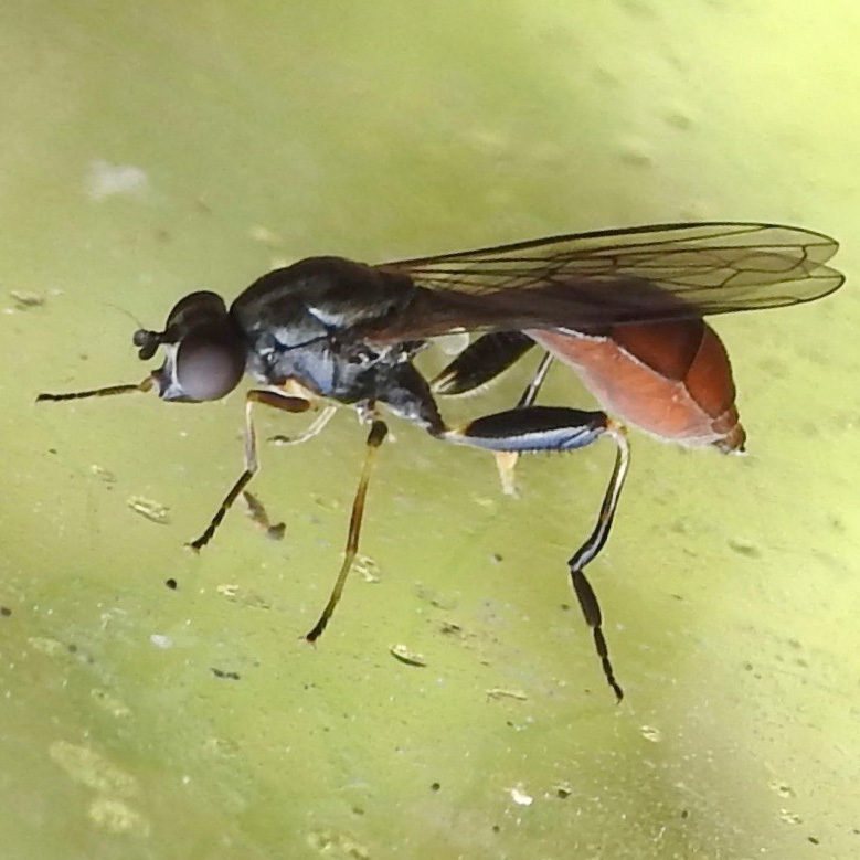Distinctively ichneumon-mimic syrphid with black thorax and red abdomen. Rear legs black with fibula greatly enlarged. In greenhouse 20th June, 2025.