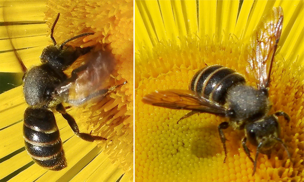 Distinctive dark bee robustly built with a sharply defined rear margin to the head. Tergites 1-4 have translucent hind margins, and on tergites 2-4 these overlie creamy-white pigment bands, creating a banded effect that is not seen in any other British Stelis species. Thorax dull due to covering of fine grey hairs. Large dark brown stigmata in wings.