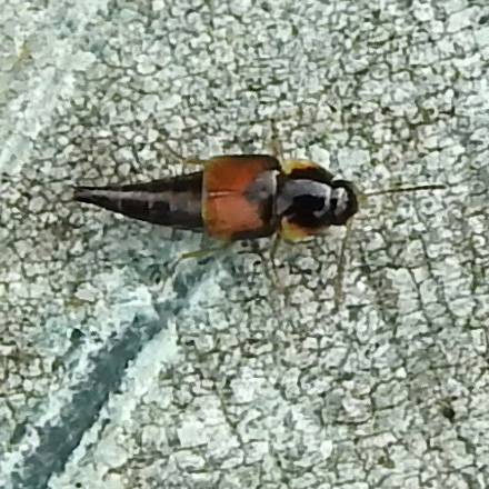 Tiny rove beetle (3 mm) with black head, black pronotum with yellowish lateral flanges and red wing cases. Abdomen tapered and black. In wild flower border.