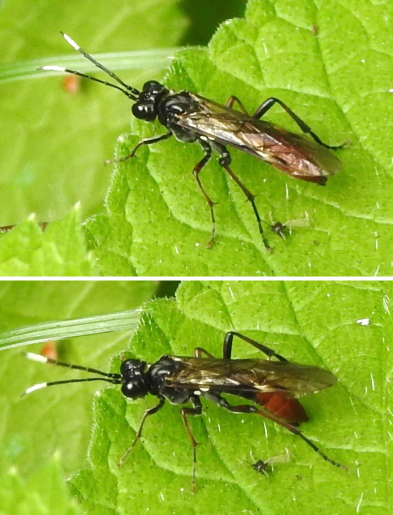 Large (>1 cm) black-bodied sawfly with black antennaewith a white end. Posterior of abdomen red. Legs all black. Wings with white-pale brown stigma. 22ndh May, 2025 on hogweed leaf at bottom of garden.