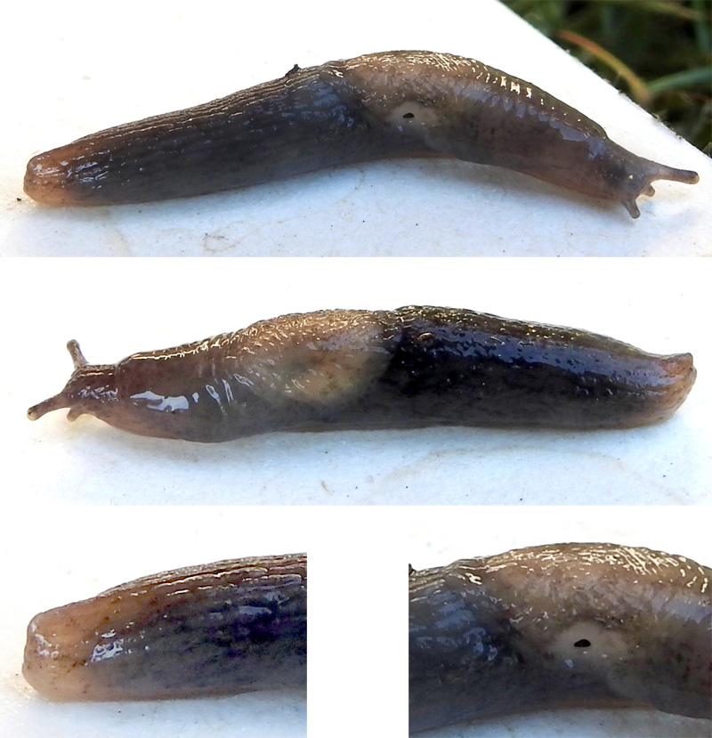 Medium-sized, dark slug with pale, flesh-coloured centre to mantle. A keel extends a short way up the body from the tip. Tip of tail almost vertically truncate. Mantle smoother with finger-print type ornament almost half of length; breathing pore surrounded by a pale ring.