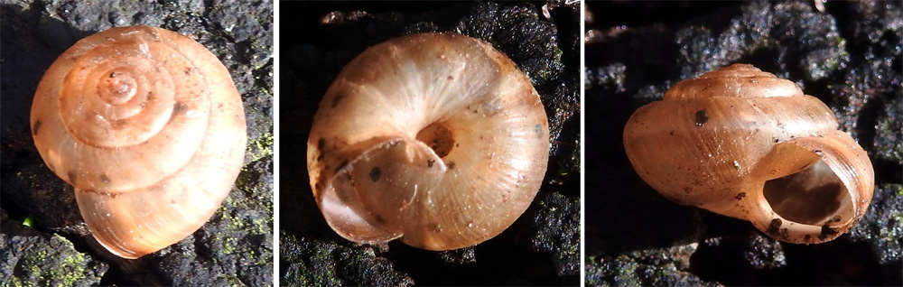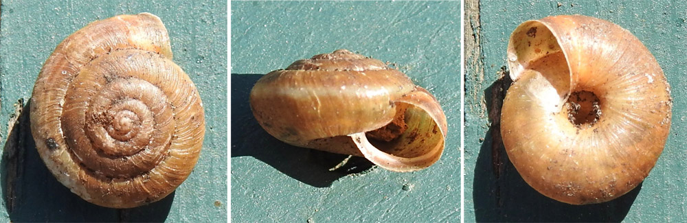 Shell 12 mm in diameter with low spire; 6 whorls; colour a pale brown (dead shell); marked with obvious growth striae. Rounded ambitus. Aperture wider than tall. Umbilicus rather wide, but not showing inner whorls and partially covered by final whorl lip.