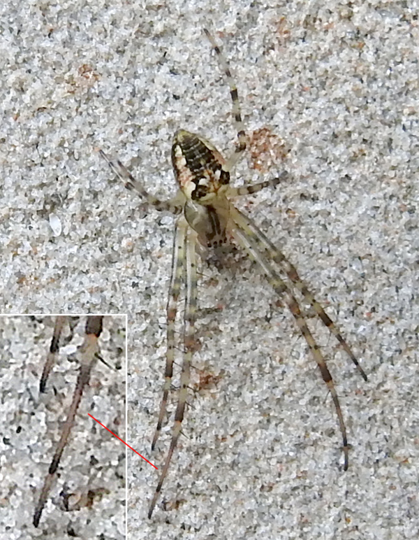 Medium-sized spider variably patterned but with characteristic pale carapace with central, dark tuning-fork mark. Anterior legs longest and medtatarsus and tarsus of front legs without long hairs. On proch at night 7th August, 2025. Possibly also seen later in year (29th September).