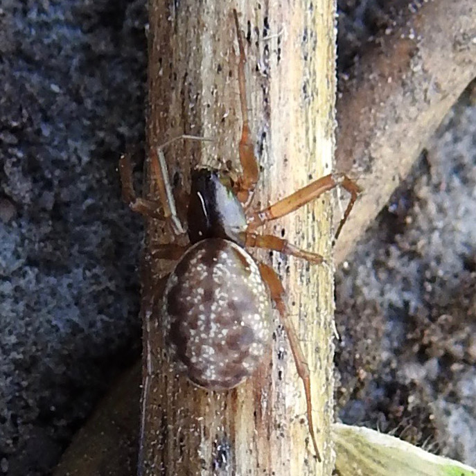 Tiny (4-5 mm), spider with black carapace and brown/white mottled abdomen with brown lobed folium and central brown line. Legs orange-brown.
