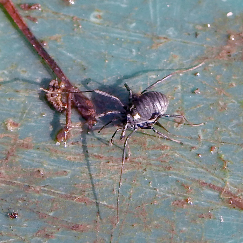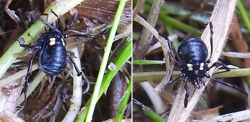 Tiny opilionid dark-blue in colour but with two pairs of white spots near the anterior.