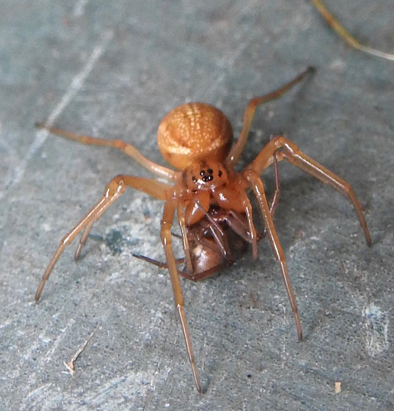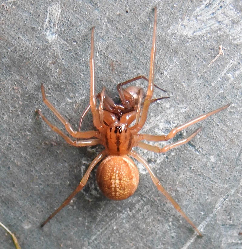Spider with brown carapace with a darker median band and fainter diagonal bands. Globular abdomen with strongly contrasting black and cream patterning; legs pale. Chelicera large and pale. Carapace colour and patterning suggests P. clercki rather than P. degeeri but microscopic examination of genitalia is required to confidently separate these two species.