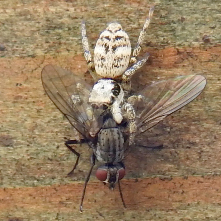 Medium-sized, fast moving spider. Females black with white stripes on the abdomen. Males overall lighter with more white hairs, but with similar distinctive black and white banded abdomen and marginal white band on carapace. Legs weakly banded. Association with garden and buildings strongly indicate scenicus but microscopic examination required to confirm.