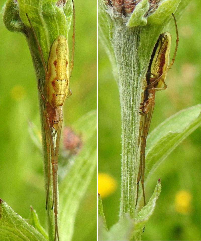 Very elongate spider around 1 cm in length with 3rd pair of legs very short in comparison to others; anterior pair of legs the longest. Eight eyes. Abdomen mottled with a distinct finely mottled midline band and lateral wavy pale line. Legs spotted. Underside all black. Species determination not possible with certainty but darker and less silvery green abdomen and black sternum suggests montana.